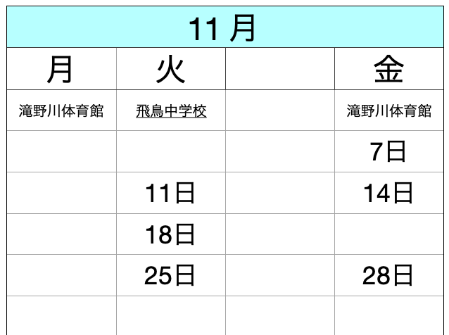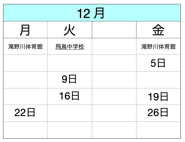 *稽古は基本的に1ヶ月に6回又は7回です。ただし、滝野川体育館の利用は北区スポーツ推進課の抽選の結果によります。